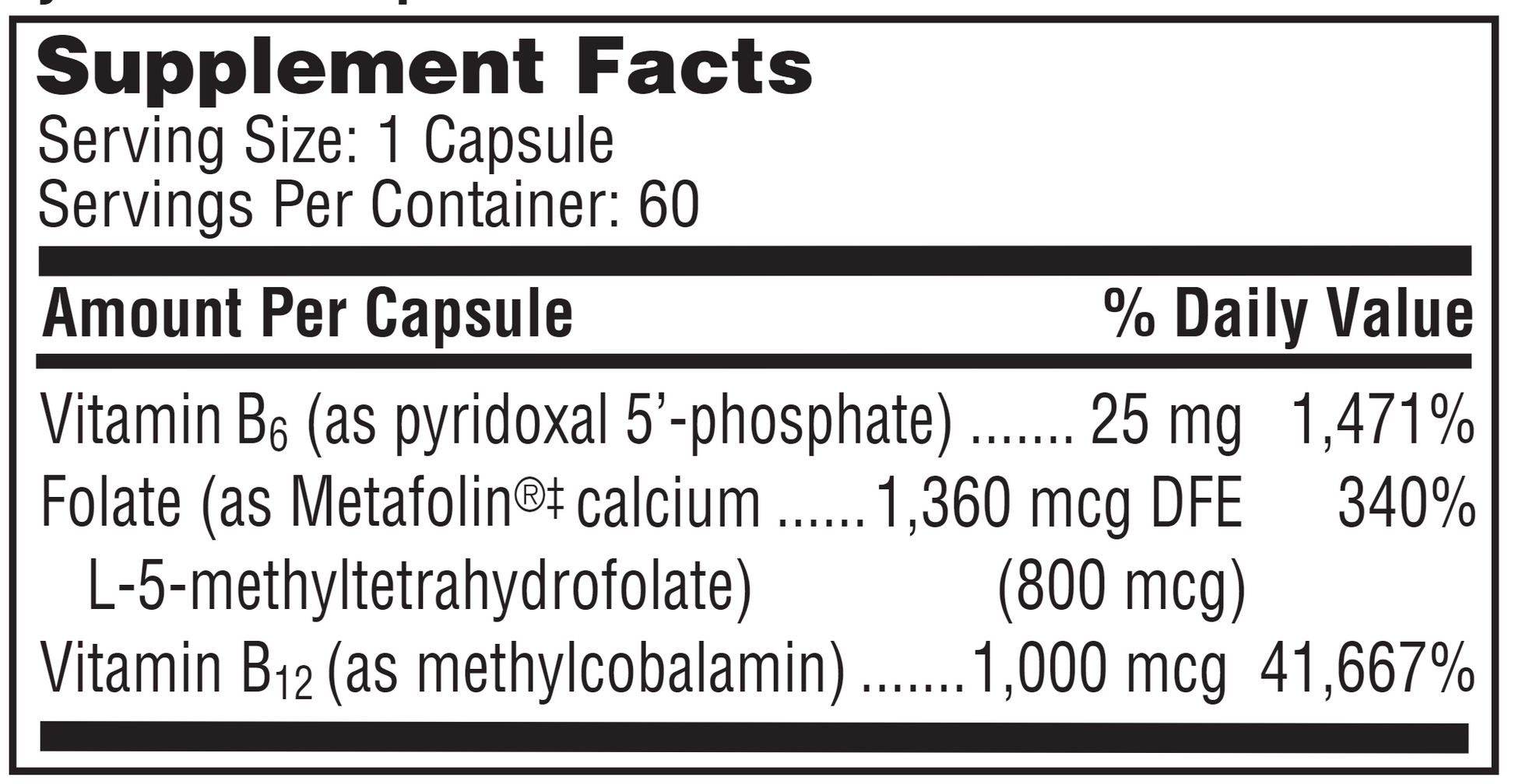 Supplies bioactive forms of three essential B vitamins: vitamin B12, folate, and vitamin B6 in small, easy-to-swallow vegetarian capsules.