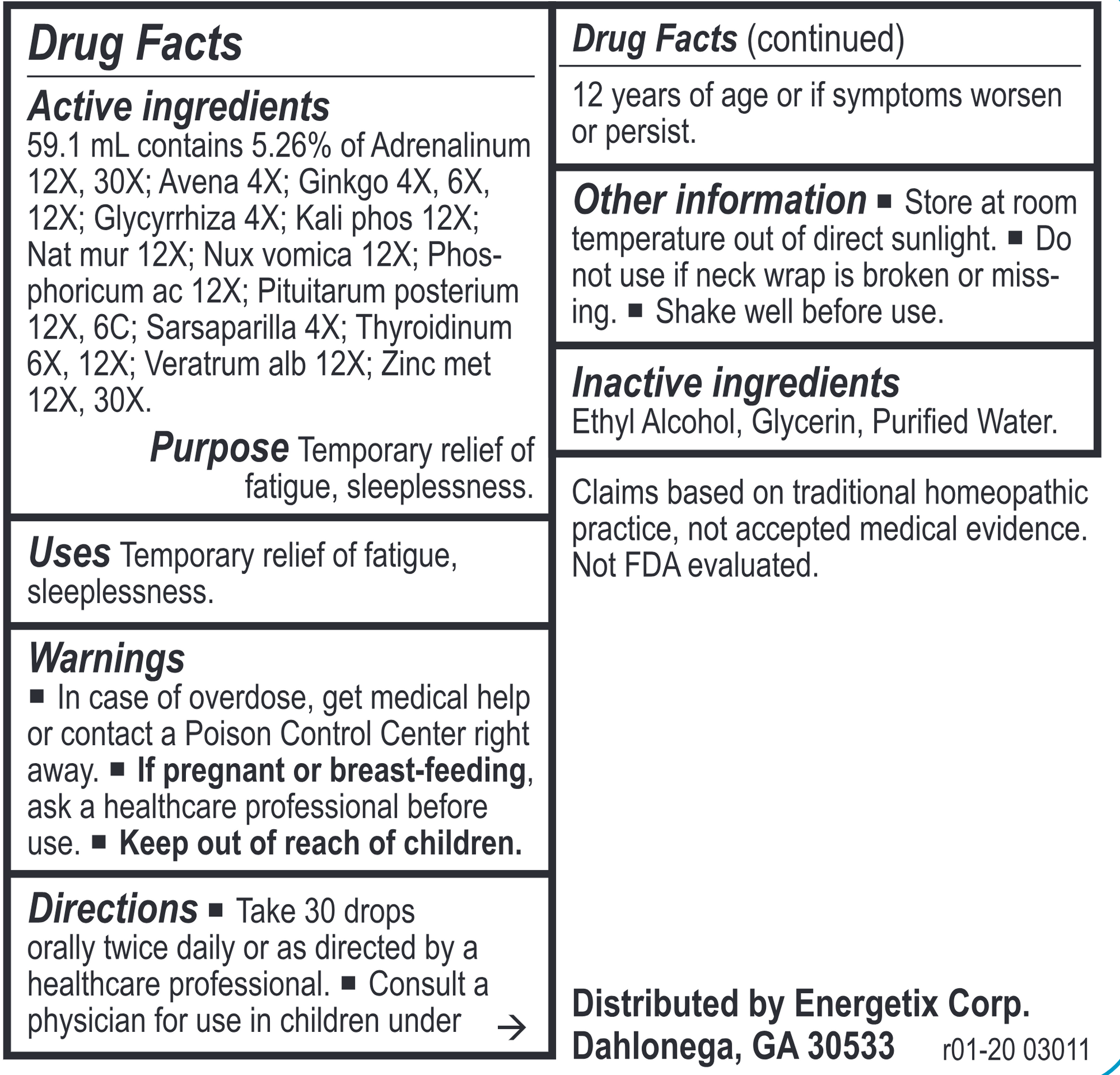 Active Ingredients: 59.1 mL contains 2.7% of Adenosinum cyclophosphoricum 8X, 15X, 30X; alpha-Lipoic ac 12X; Arg met 12X; Avena 4X; Capsicum 4X; Citricum ac 4X; Coenzyme A 8X, 30X; Cuprum met 12X; Ginkgo 4X; Glandula suprarenalis suis 9X, 12X, 6C; Glycyrrhiza 4X; Hypothalamus 12X, 6C; Iodium 12X; Ledum 6X, 12X; Mang acet 12X; Nadidum 12X; Nat carb 12X; Oleum morrhuae 6X; Phosphoricum ac 12X; Picricum ac 12X; Riboflavinum 12X; Selenium 12X, 15X; Sepia 12X; Silicea 12X; Thiaminum hydrochloricum 8X; Thyroidinum 9X, 12X, 6C; Vanadium 12X.