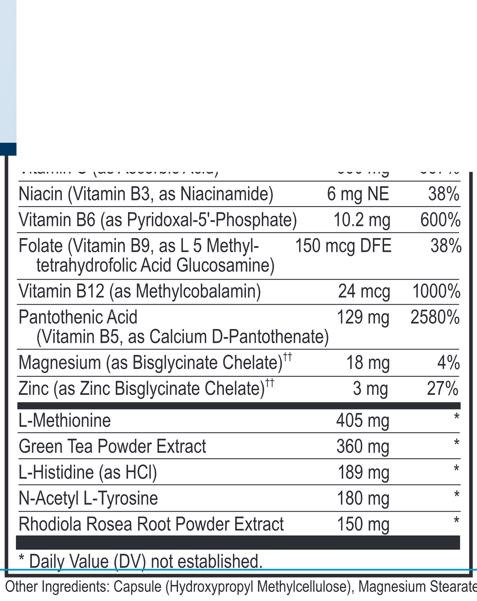 This comprehensive dietary supplement provides key vitamins, minerals, and neurotransmitter precursors, as well as rhodiola rosea and green tea extract.