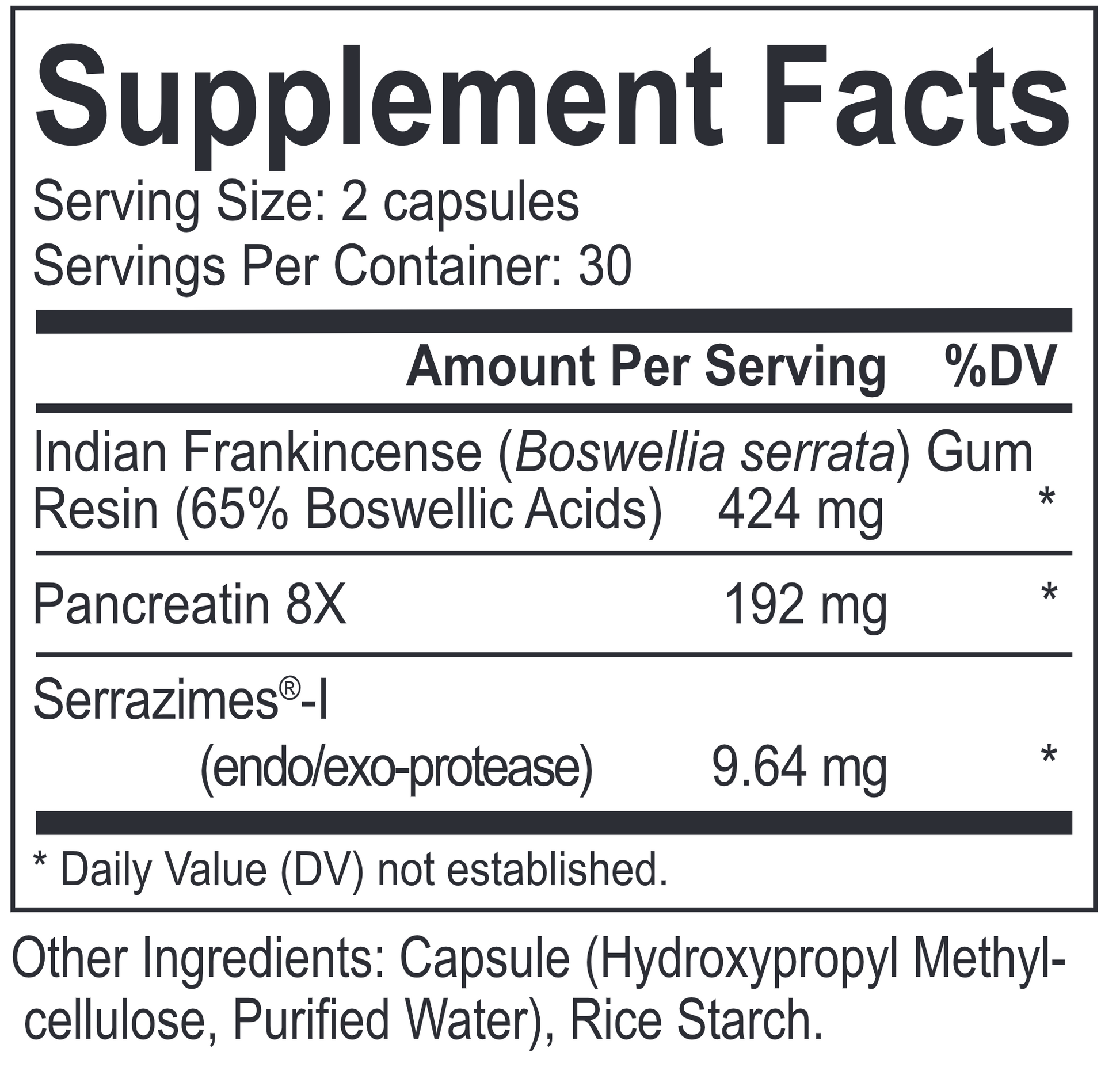 BoswelliaZyme Complex helps support normal prostaglandin response in the body, normal cartilage and joint function, and maintains the body’s natural response to injury.
