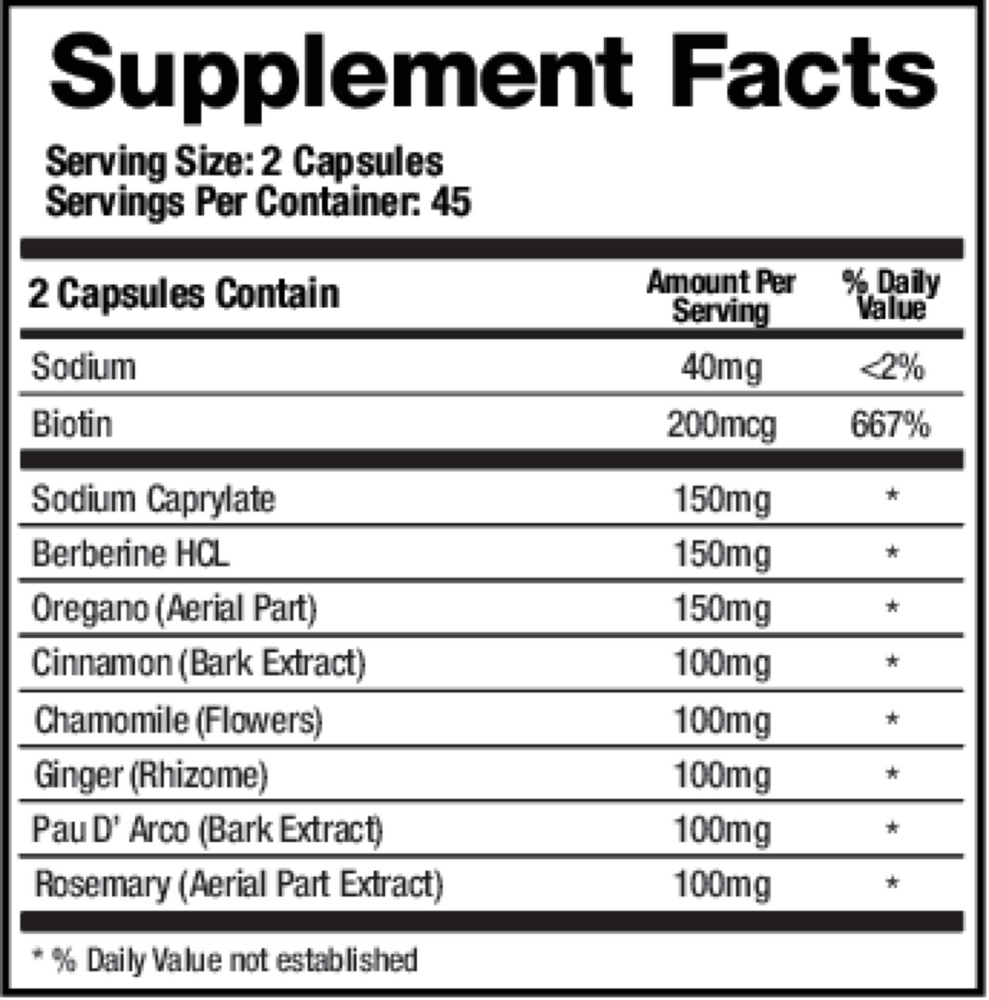 Candid-X provides a blend of nutrients, potent botanicals and essential oils to promote healthy microbial balance and immune support. Formulated with the goal of building a healthy gastrointestinal (GI) flora, Candid-X includes biotin, a nutrient that inhibits yeast from converting into the more aggressive fungal form. In addition, sodium caprylate is included to disrupt the metabolism of Candida and create a hostile environment for colonization. It also includes potent botanicals, such as berberine HCl, Pau d’Arco, oregano, rosemary, cinnamon and ginger, to sooth the GI tract, provide potent antioxidant support, and ensure microbial balance. A Candida yeast overgrowth can cause a variety of problems including digestive complaints (bloating, abdominal discomfort, diarrhea and constipation), immunity impairment (increased number of infections, autoimmune diseases), fatigue, problems concentrating, problems with memory (brain fog, forgetfulness) and issues with mood. Herbal extracts such as Oregano leaf, Pau d’arco, rosemary leak and cinnamon bark are included to support normal gut flora while also having both anti-fungal and anti-bacterial activities to prevent the re-mergence of Candida and other abnormal fungi or bacteria. In order to support intestinal healing, specific ingredients have been included in Candid-X. In the presence of biotin, yeast is unable to change into the mycelium form which is needed for its proliferation. Chamomile and cinnamon calm and soothe an upset stomach, reduce diarrhea by slowing intestinal movement, and act as an anti-inflammatory agent. Ginger has been used for centuries to calm an upset stomach and to reduce nausea, stomach and abdominal pain. Rosemary can reduce digestive discomfort.