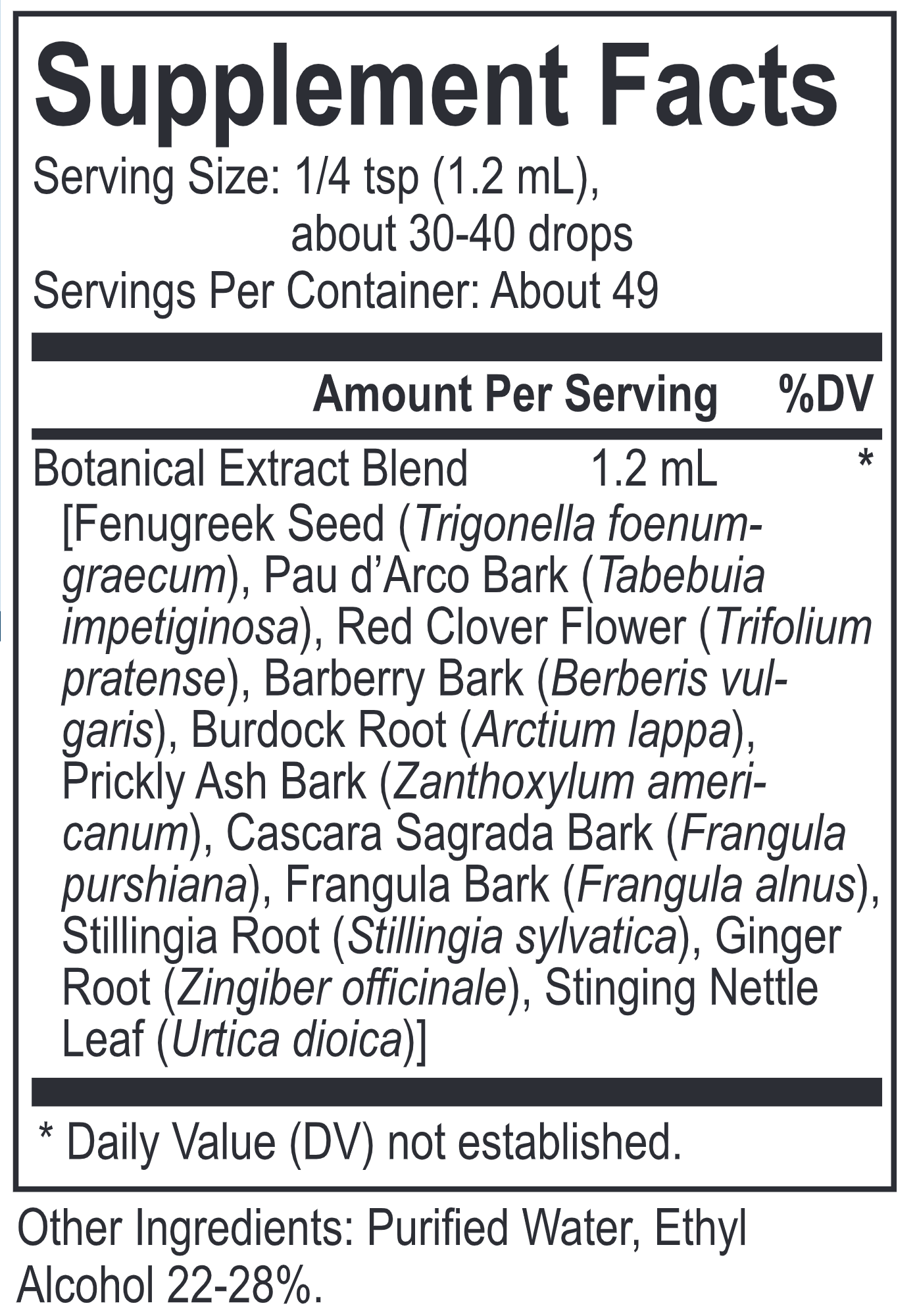 [Fenugreek Seed (Trigonella foenum-graecum), Pau d’Arco Bark (Tabebuia impetiginosa), Red Clover Flower (Trifolium pratense), Barberry Bark (Berberis vulgaris), Burdock Root (Arctium lappa), Prickly Ash Bark (Zanthoxylum americanum), Cascara Sagrada Bark (Frangula purshiana), Frangula Bark (Frangula alnus), Stillingia Root (Stillingia sylvatica), Ginger Root (Zingiber officinale), Stinging Nettle Leaf (Urtica dioica)]