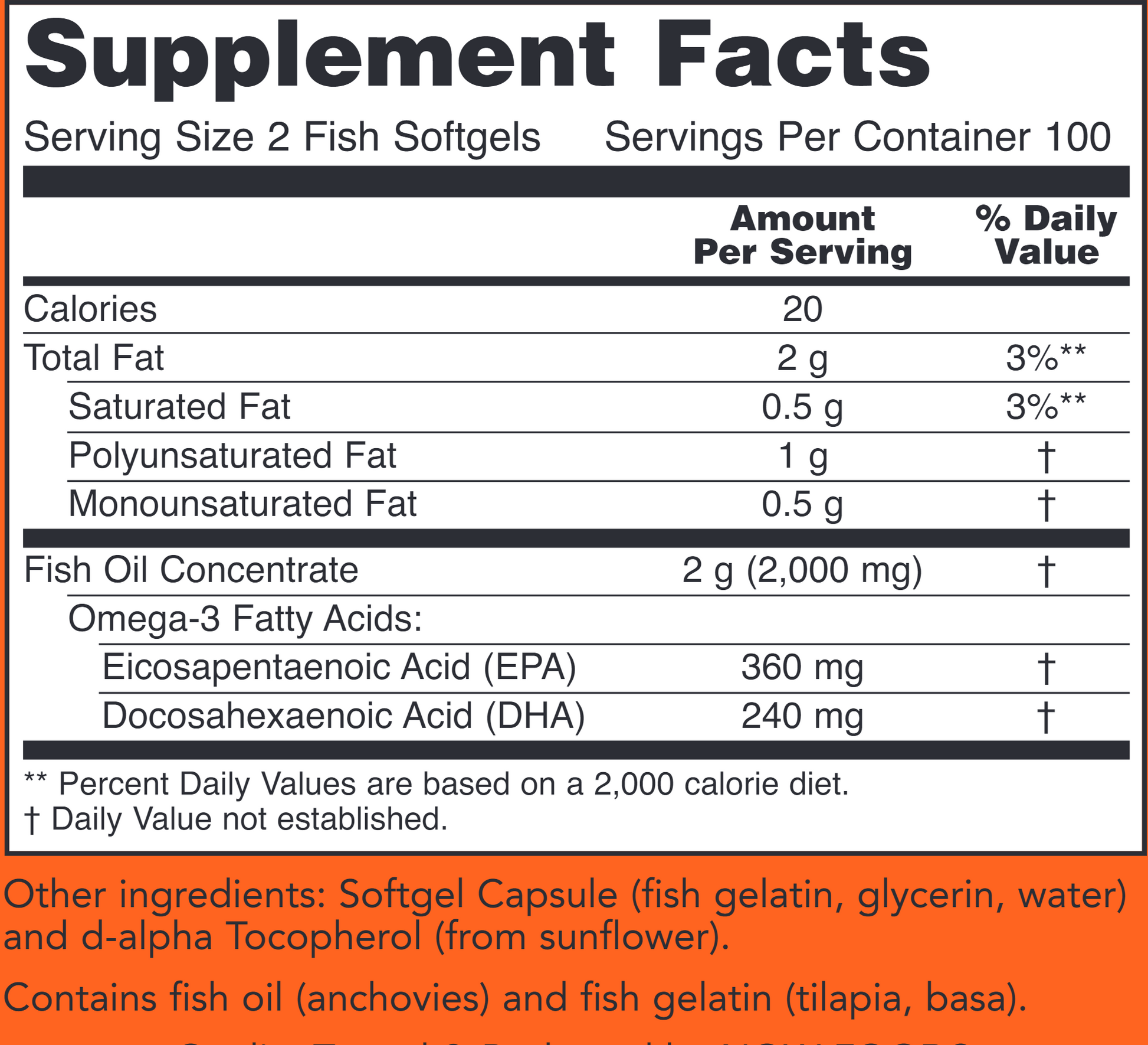 This fish oil concentrate is manufactured under strict quality control standards. It is tested to be free of potentially harmful levels of contaminants such as PCBs, dioxins, mercury and other heavy metals. This product utilizes a fish gelatin softgel providing an alternative to bovine and porcine gelatin softgels.