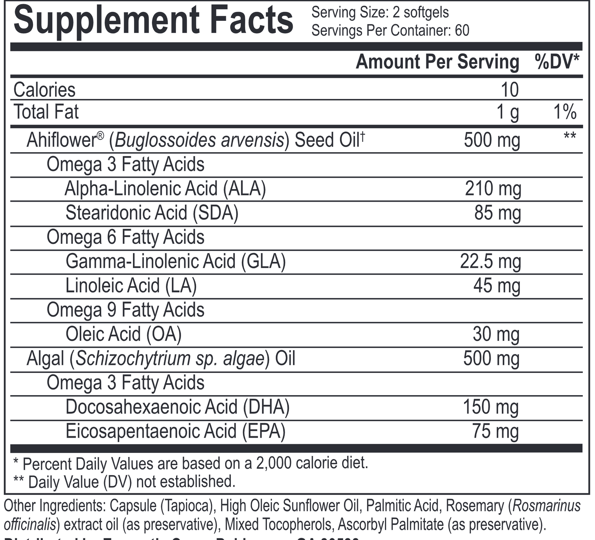 Algal Oil, Ahiflower® (Buglossoides arvensis) Seed Oil, Tangerine Oil, mixed tocopherol (Vitamin E), and Rosemary Extract (to maintain freshness), Ascorbyl palmitate.